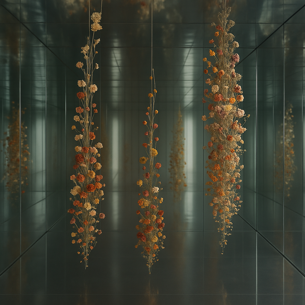 A low, natural arrangement of preserved florals and moss at the base — inspired by wild Scottish landscapes and designed to complement the mirrored setting.